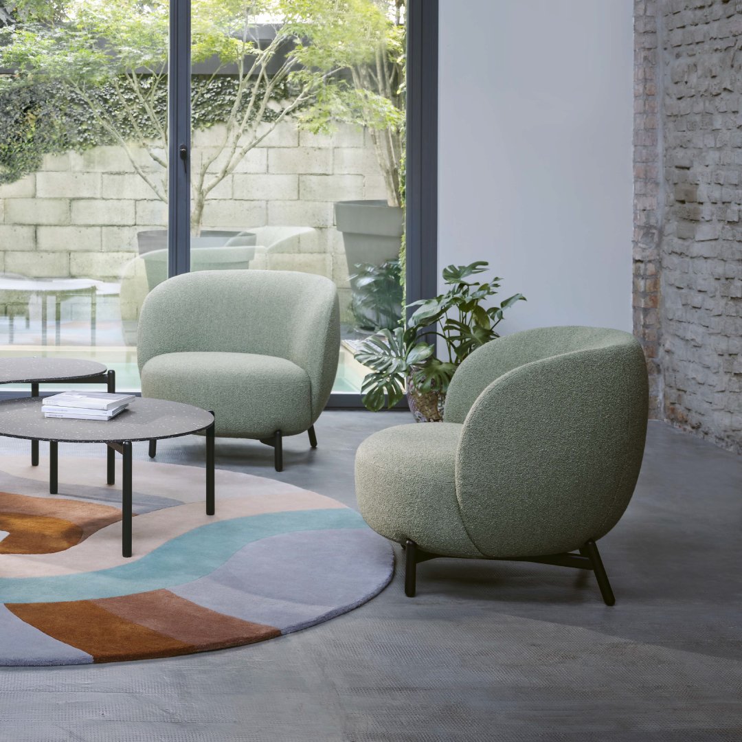 Sofa, Sessel und Pouf werden in weichem Bouclé oder Mélange Stoff angeboten und in den Farben Olivgrün, Petrol, Siena-Erde sowie in verschiedenen Grautönen angeboten.